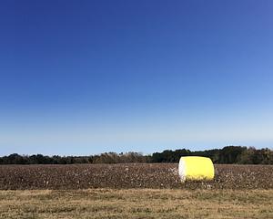 Baled cotton (“Alabama snow”) awaiting transport in the field where it was grown.